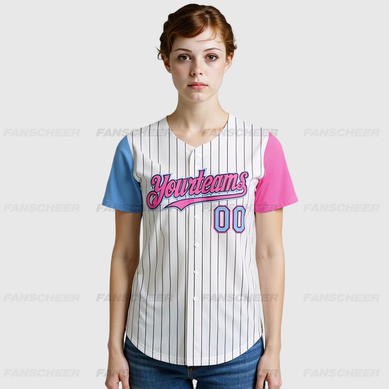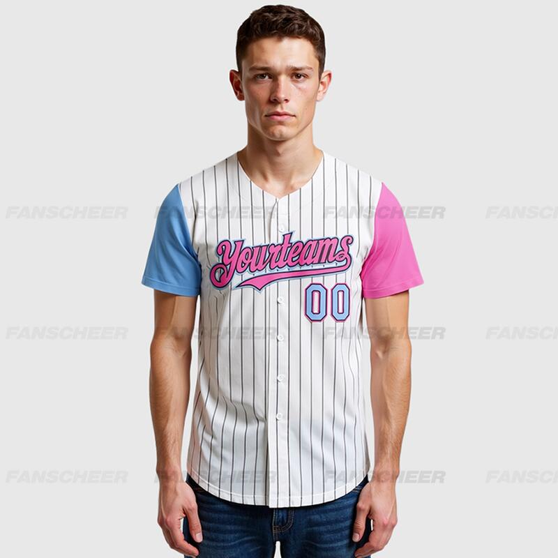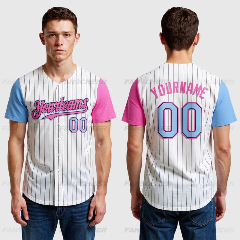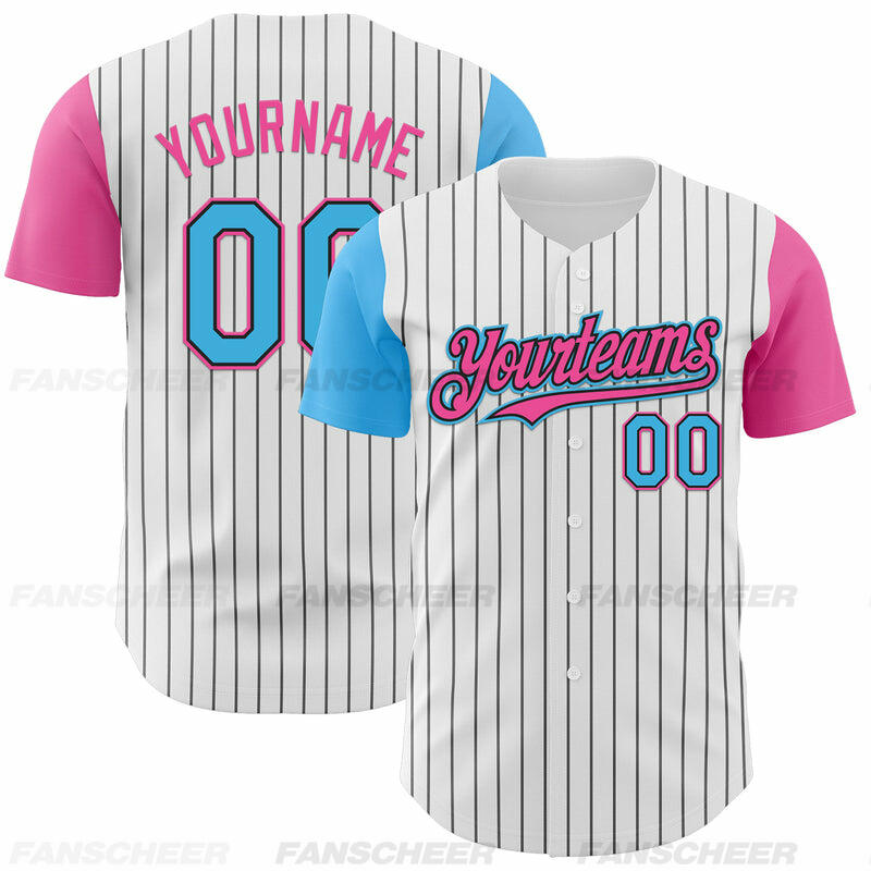 Custom White Blue Pink Pinstripe Authentic Two Tone Baseball Jersey with Personalized Number and Logo for Games Practices and Fan Events