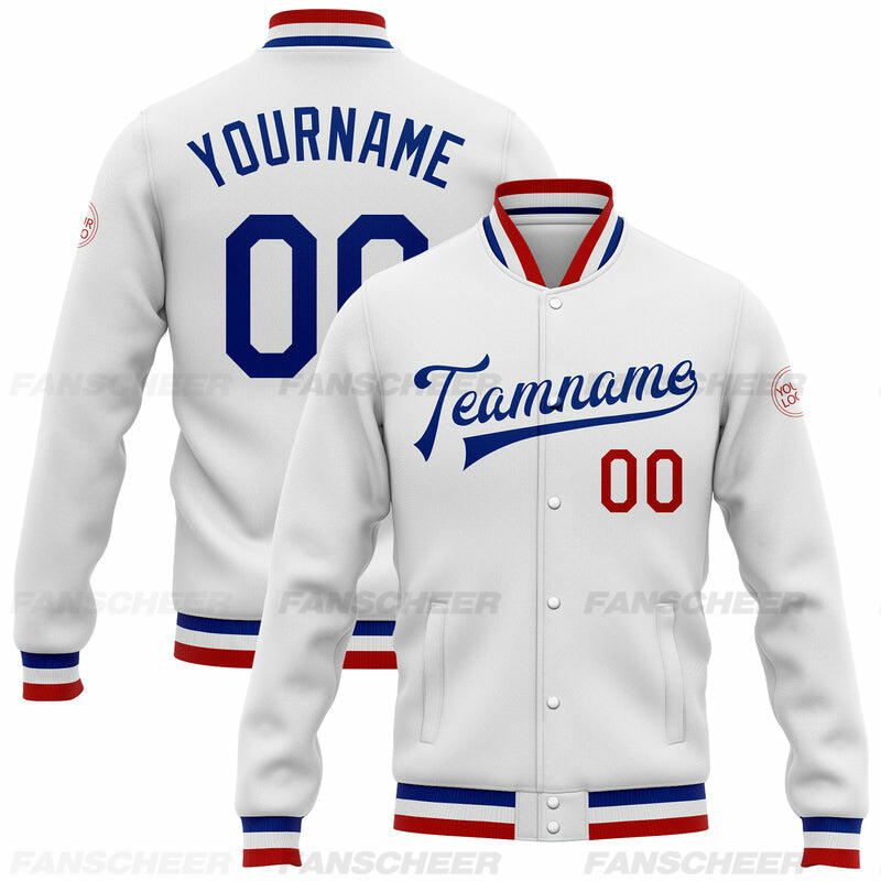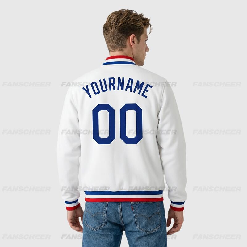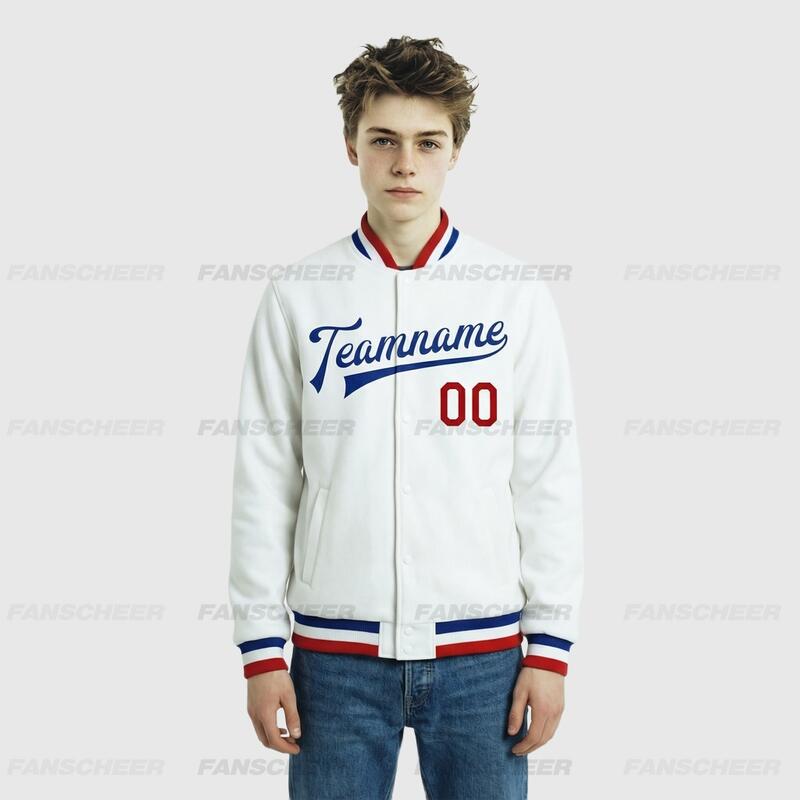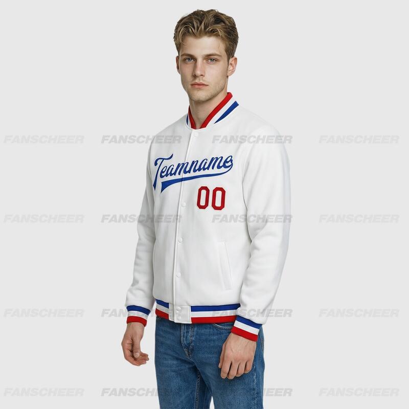 Custom White Full-Snap Varsity Letterman Jacket – Ideal for Fashion Industry Events and High-End Casual Occasions