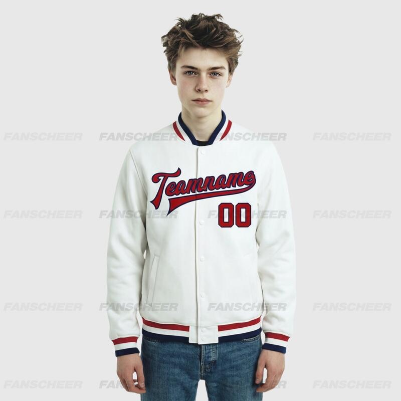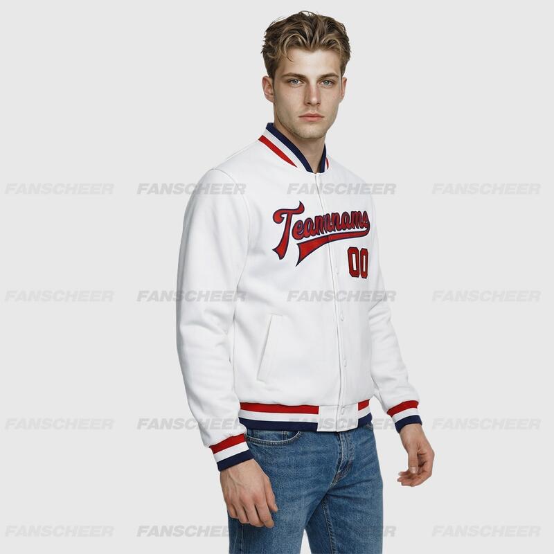 Custom White Full-Snap Varsity Letterman Jacket – Ideal for Weekend Urban Exploration and Light Travel Outfits