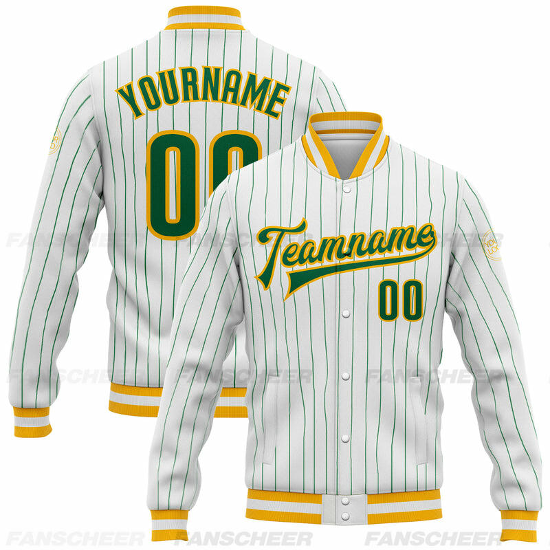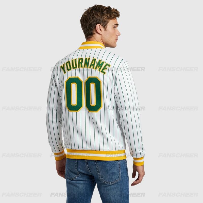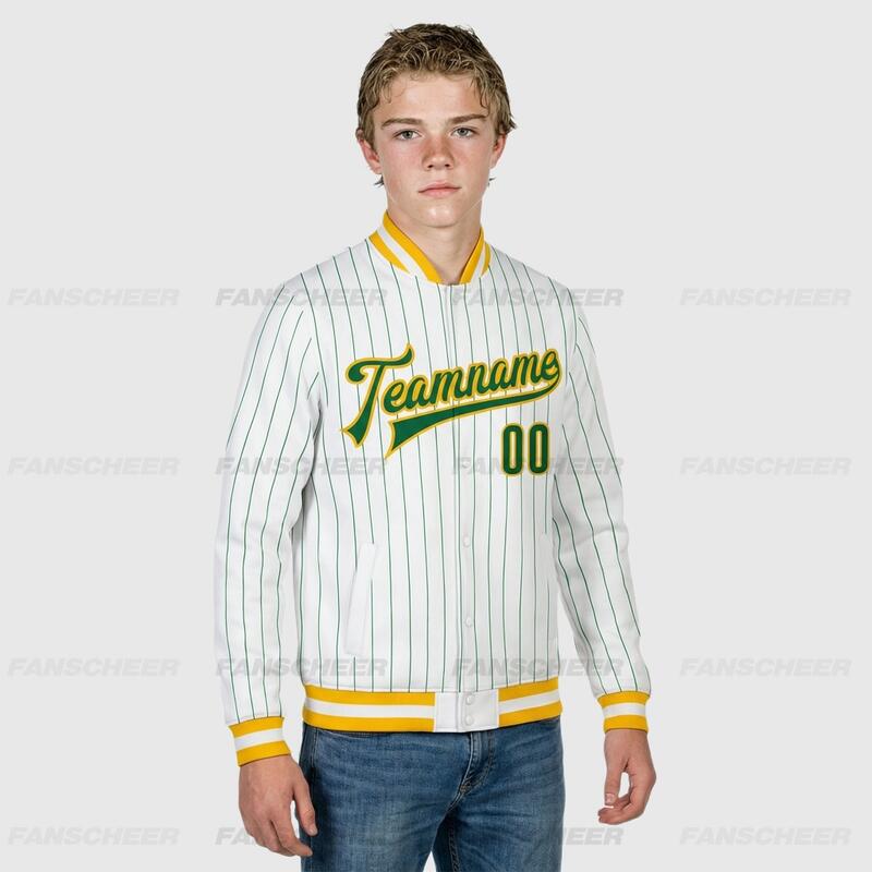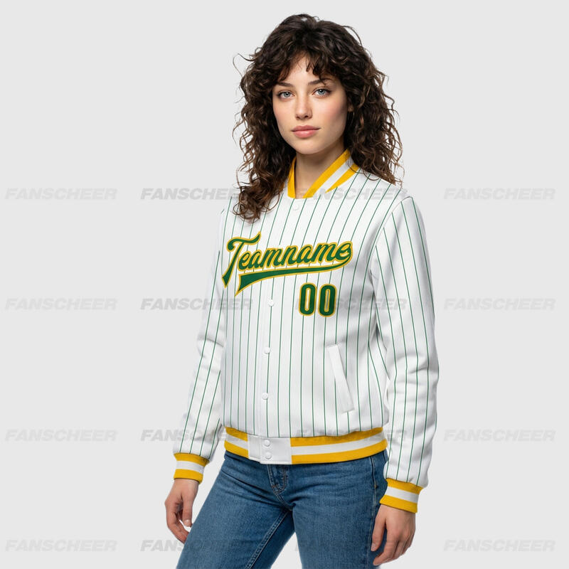 Custom White Pinstripe Full-Snap Varsity Jacket – Great for Coffee Runs