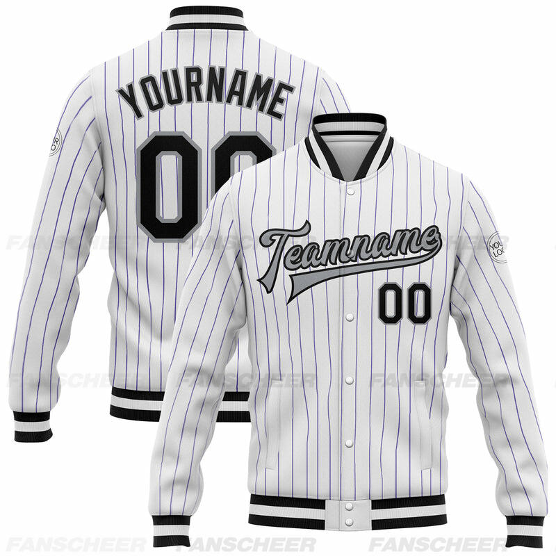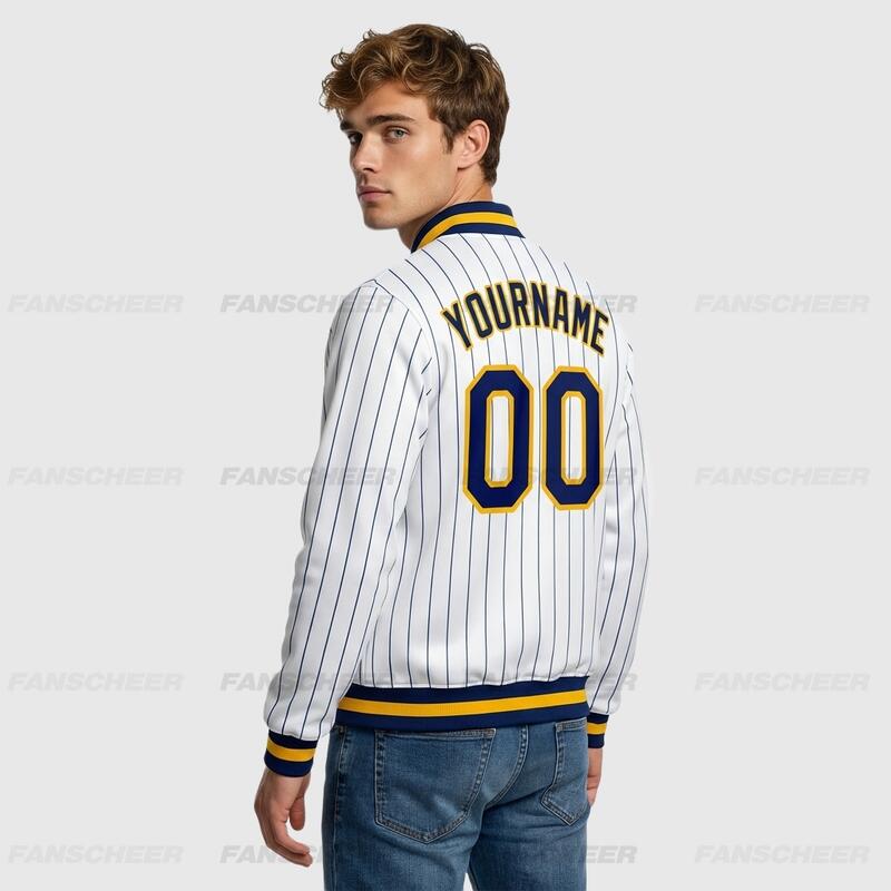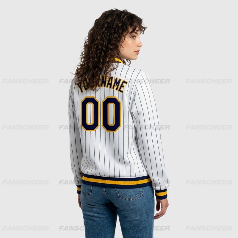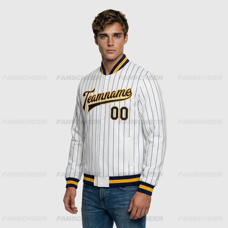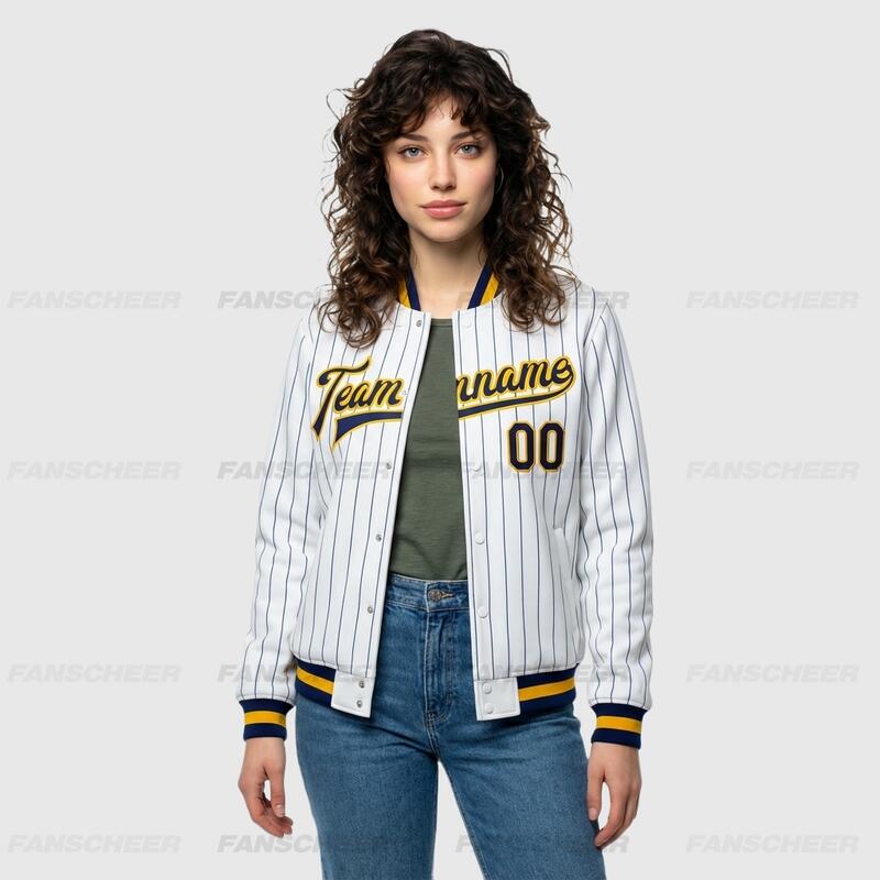 Custom White Pinstripe Full-Snap Varsity Letterman Jacket Fit for Daily Commutes and After-School Meetups