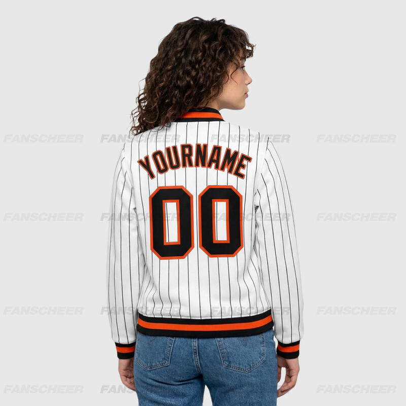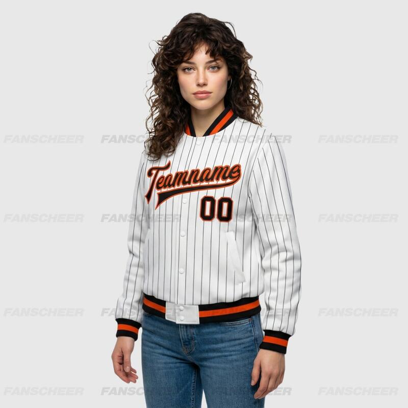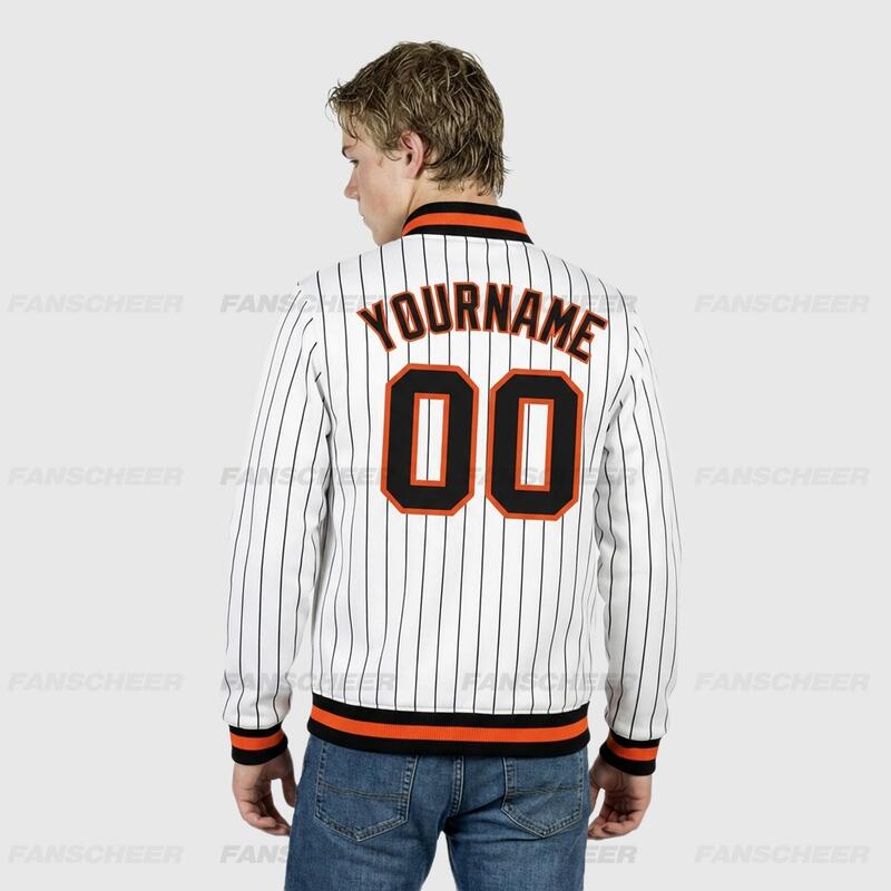 Custom White Pinstripe Full-Snap Varsity Letterman Jacket Ideal for Brunch Dates with Friends and Weekend Errands