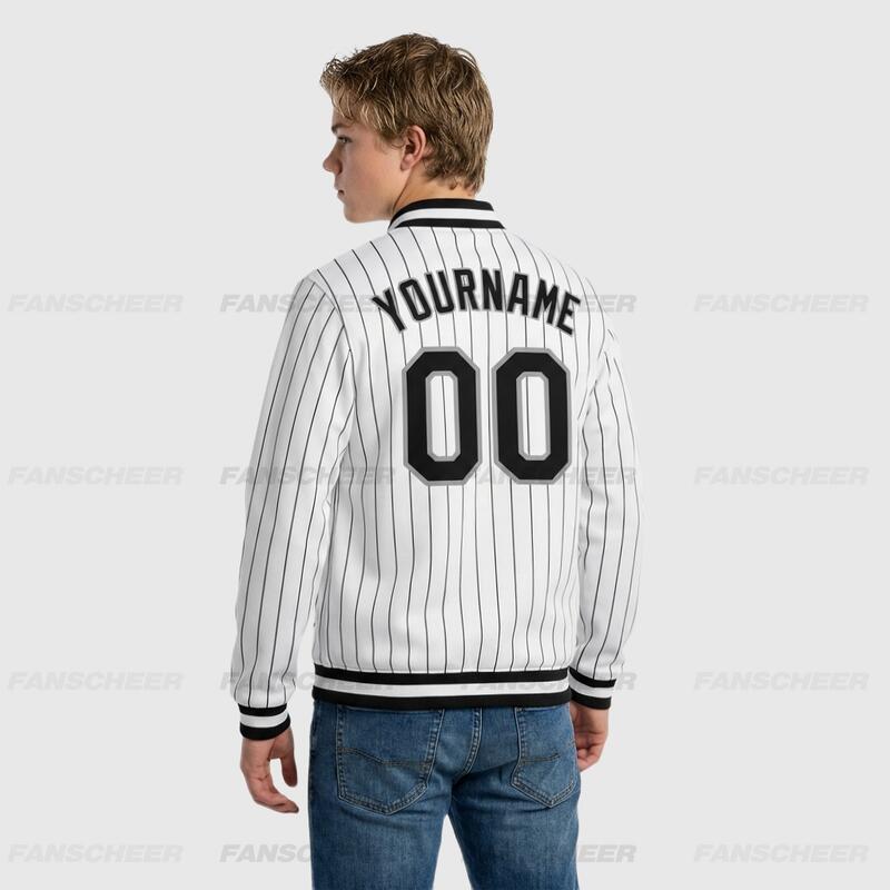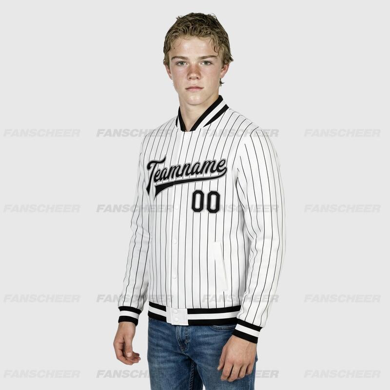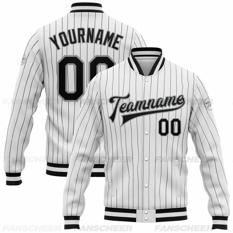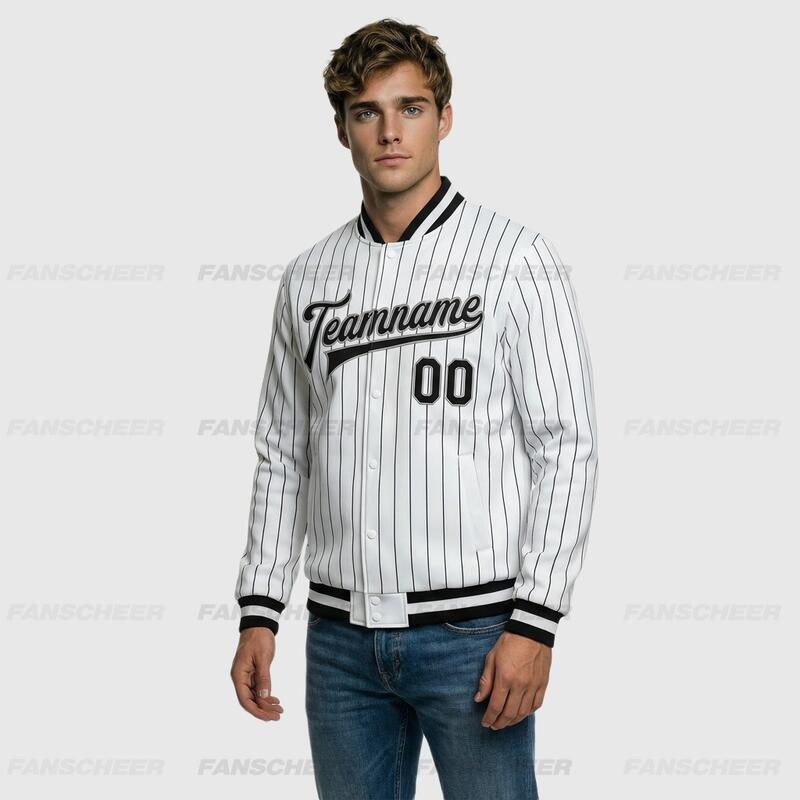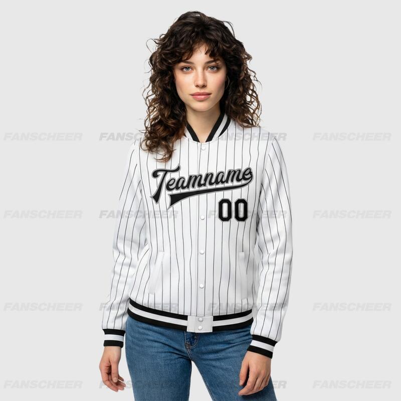 Custom White Pinstripe Full-Snap Varsity Letterman Jacket Perfect for Vintage-Themed Flea Markets and Casual Shopping