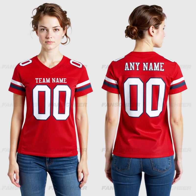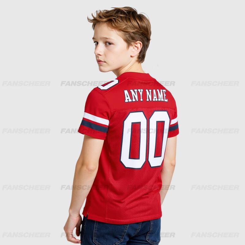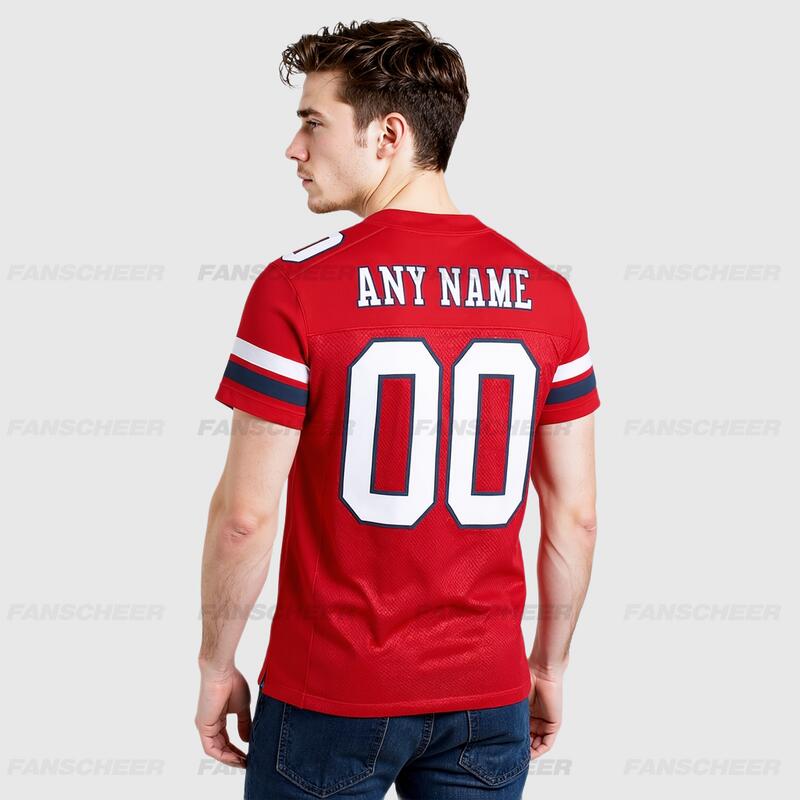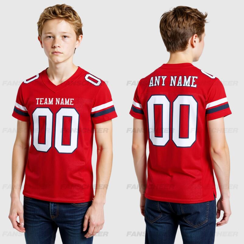 Red Custom Football Jersey Premium moisture-wicking fabric with laser-cut ventilation zones and custom heat-pressed numbering